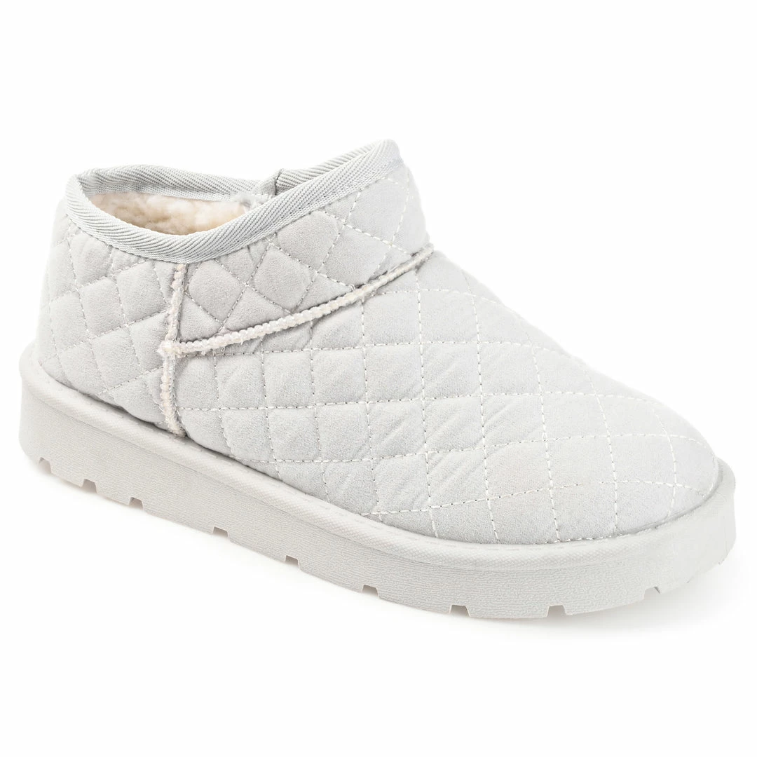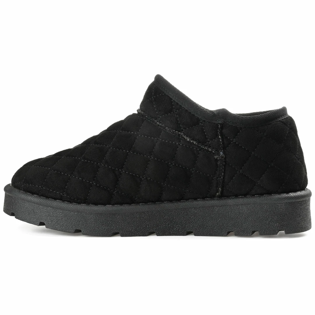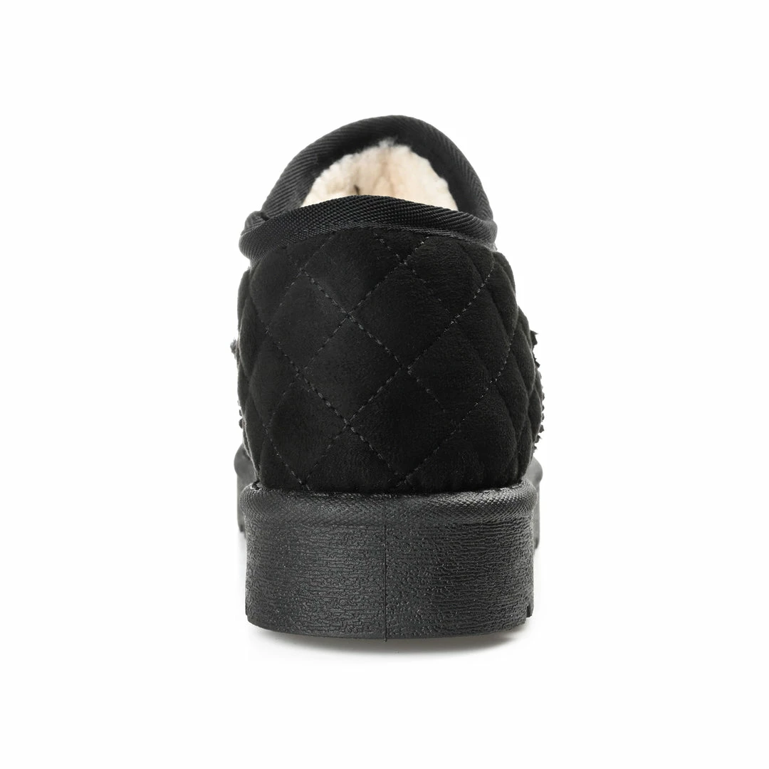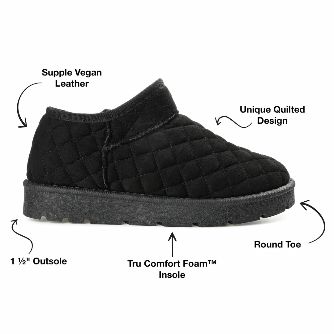 Comfort comes easy with the Tazara slipper by Journee Collection. This quilted slipper is designed with supple vegan leather lined with the softest faux fur for extra warmth. A 6 mm Tru Comfort Foamβ’ footbed adds the right amount of support, and a treaded outsole provides durability so you can wear them out too. Heel Height – 1 1/2-inch Heel Type – Sole Platform Height – 1-inch Shaft Height – 3 inches Top Circumference – 13 inches Shoe Width – Medium Closure Type – Slip-on Toe Style – Round Lining – Faux Fur Upper Material – Vegan Leather Outersole Material – Man-made Footbed – 6 MM Tru Comfort Foamβ’