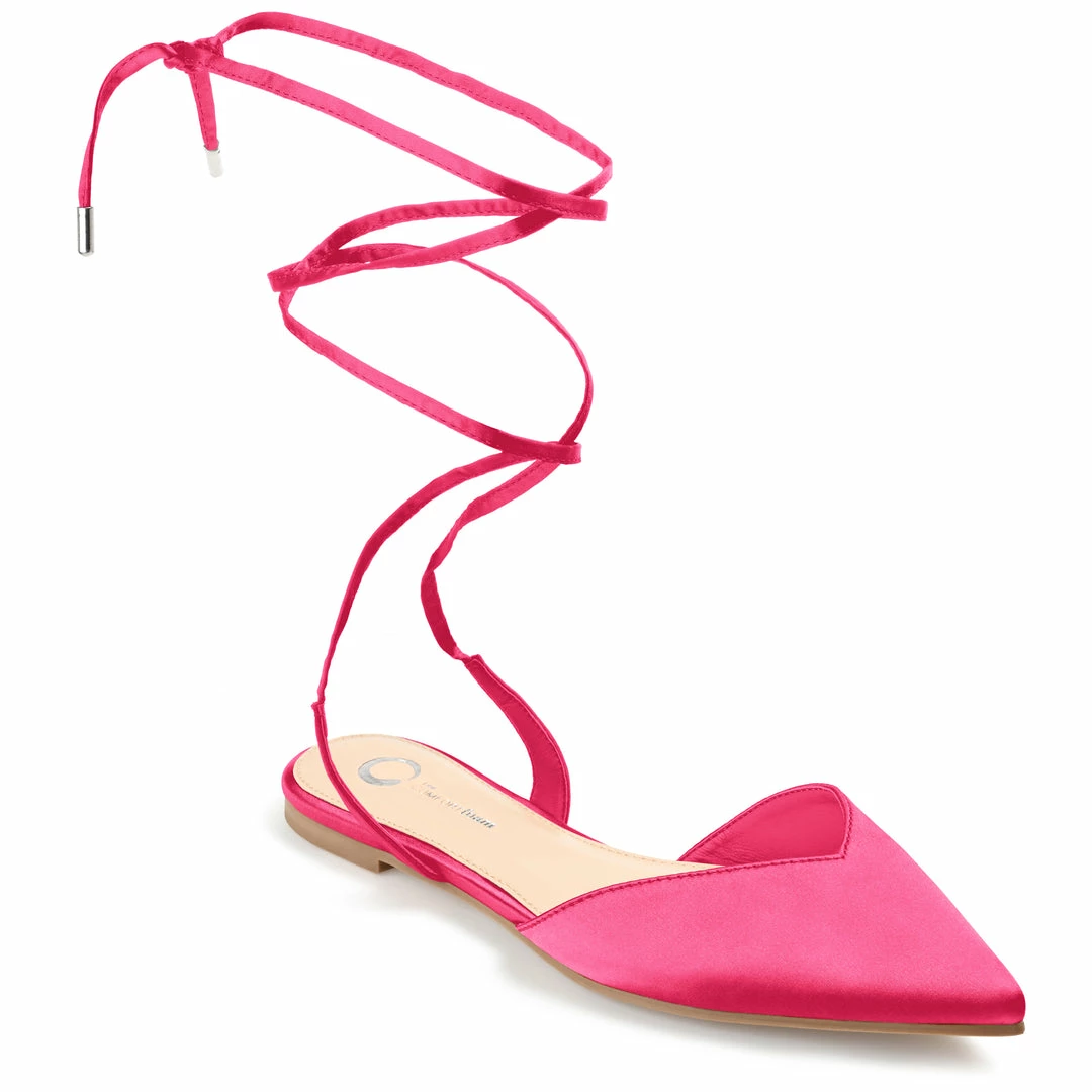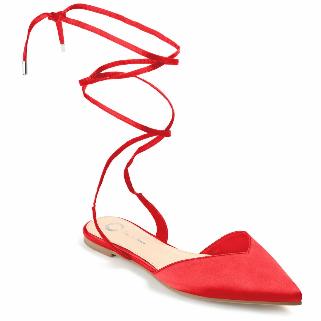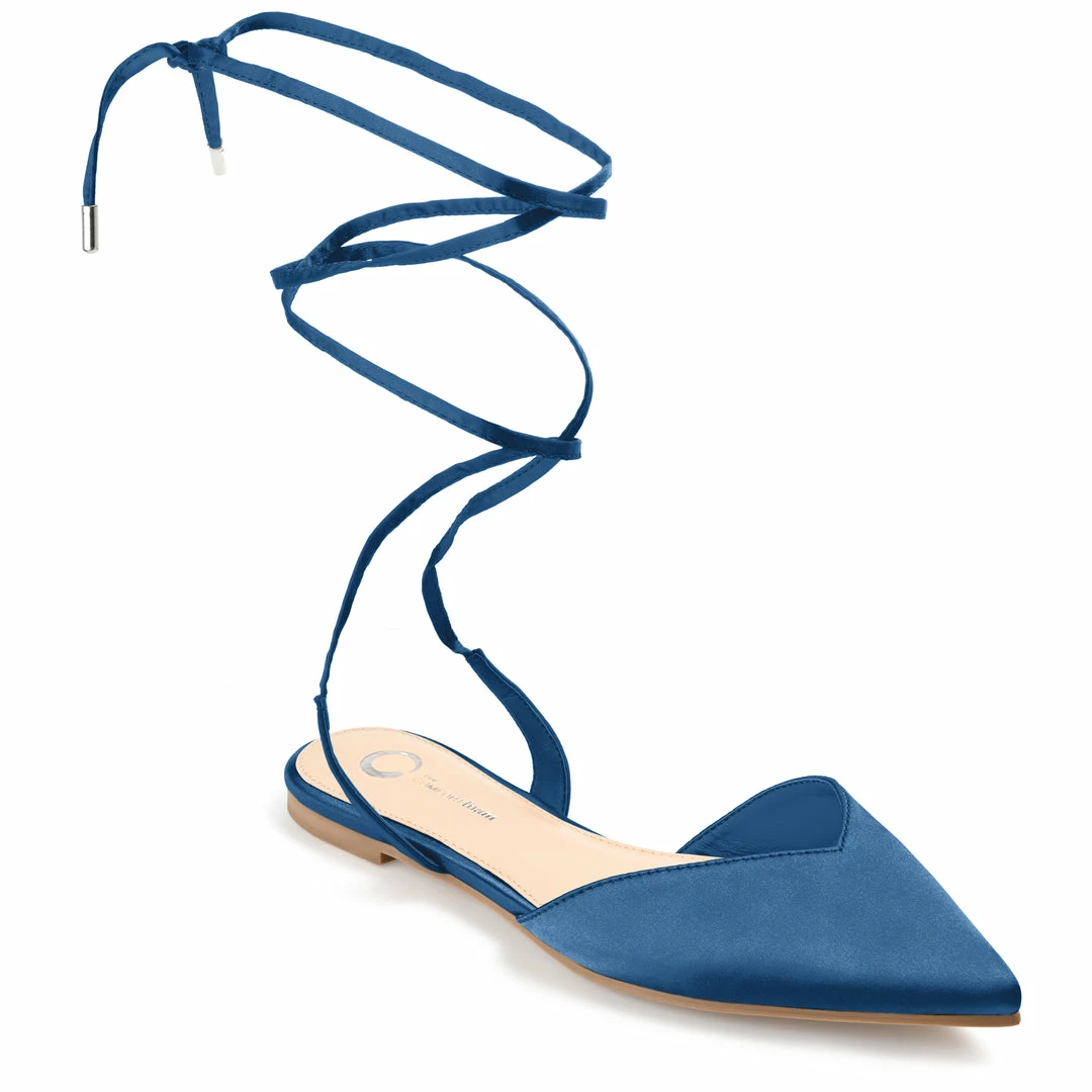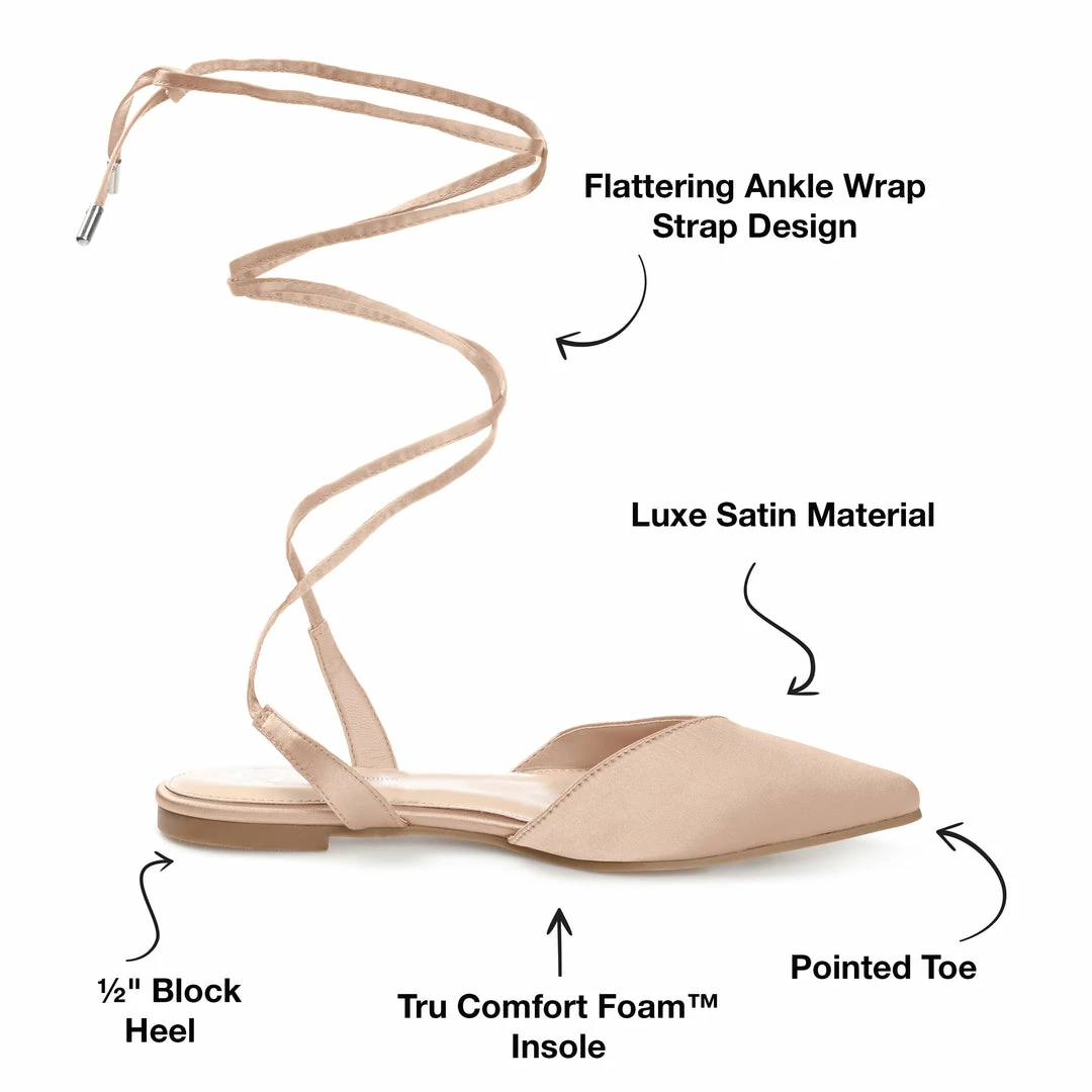 A party look without the fuss, the Theia by Journee Collection. This pointed-toe flat features silky satin uppers topped with a wraparound tie at the ankle for a ballet-inspired look. A 4 mm Tru Comfort Foamβ’ insole grounds the design for extra support. Heel Height – 1/2-inch Heel Type – Block Heel Platform Height – Flat-inch Shoe Width – Medium Closure Type – Tie Up Strap Type – Ankle Wrap Toe Style – Pointed Lining – Faux Leather Upper Material – Fabric Outersole Material – Man-made Footbed – 4 MM Tru Comfort Foamβ’