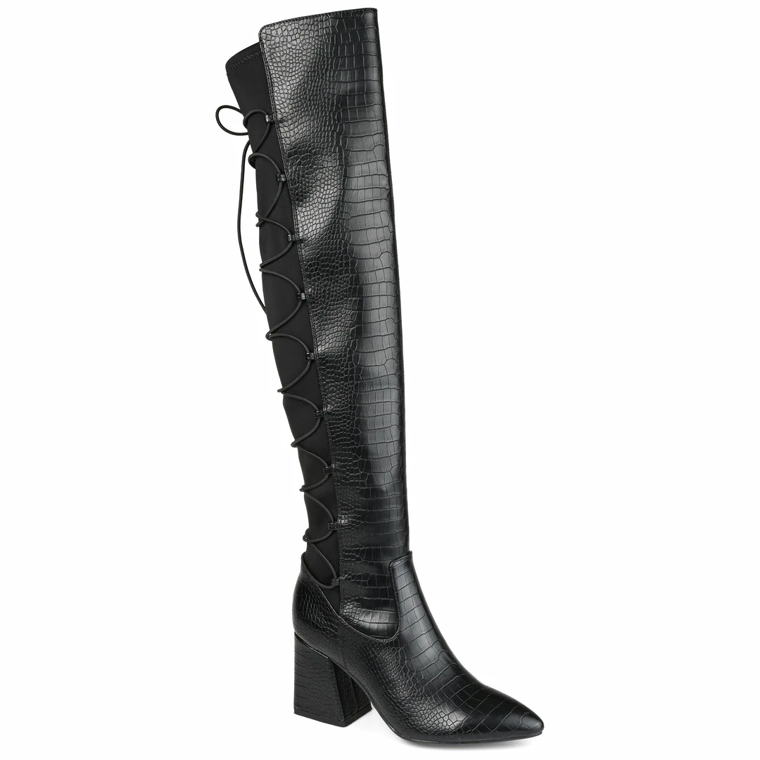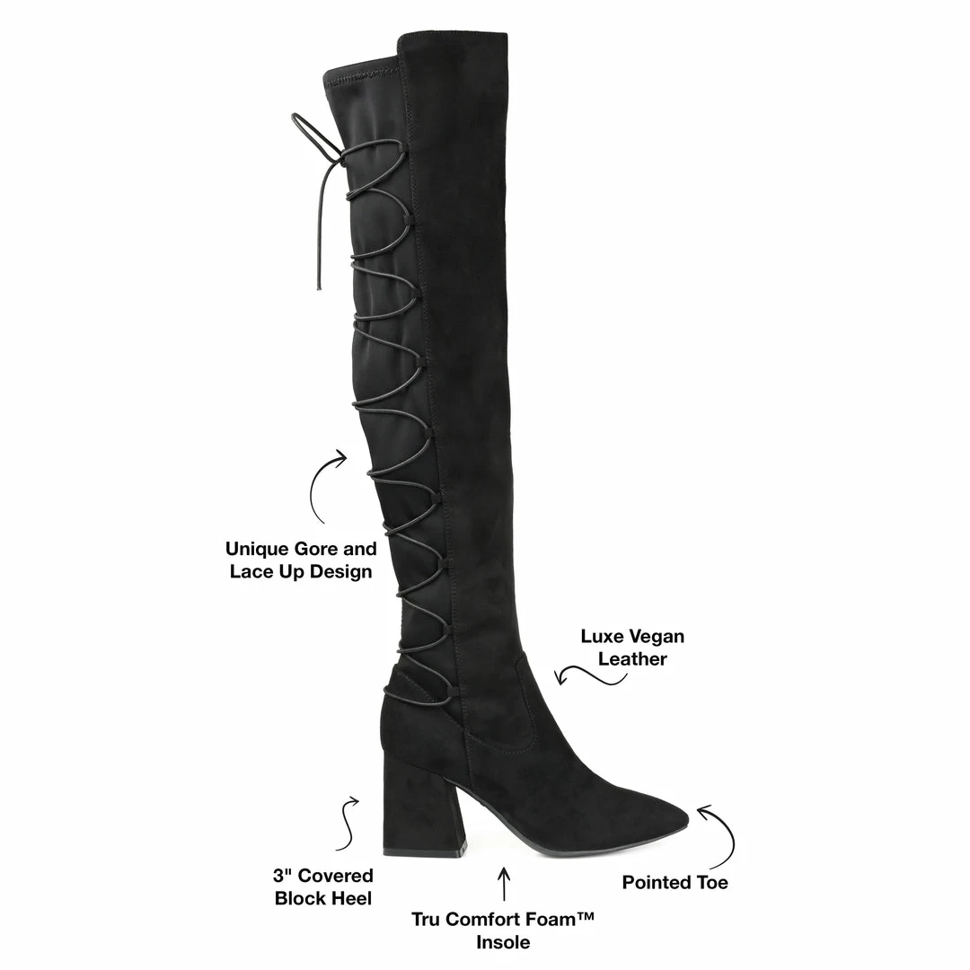 The Valorie boots by Journee Collection aren’t your ordinary shoes. This thigh-high boot features a pointed-toe, a 4 mm Tru Comfort Foamโข footbed, and soft vegan leather detailed with a forgiving stretch gore accent. A covered block heel and a back-lace design give this versatile style a modern touch. Heel Height – 3-inch Heel Type – Block Heel Platform Height – Flat-inch Shaft Height – 20 1/2 inches Calf Circumference – 14 inches Top Circumference – 16 inches Shoe Width – Medium Closure Type – Pull-on Toe Style – Pointed Lining – Fabric Upper Material – Vegan Leather Outersole Material – Man-made Footbed – 4 MM Tru Comfort Foamโข