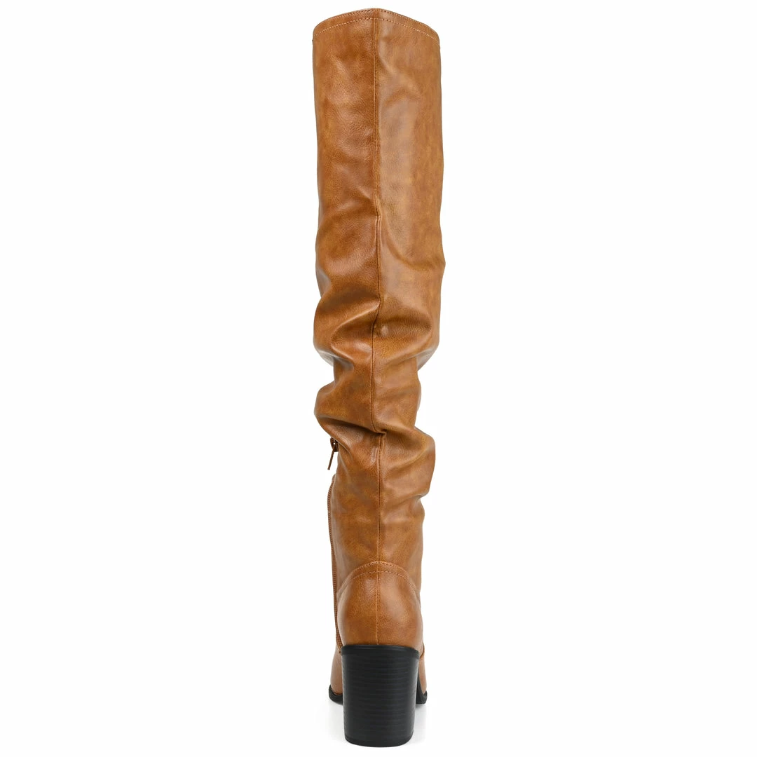 Classic but cool, the Pia by Journee Collection. This over-the-knee vegan leather boot adds a flirty finish to any outfit with its ruched details and pointed-toe. A soft 4 mm Tru Comfort Foamโข insole, a wide-calf, and chunky block heel complete this upscale design. Heel Height – 3-inch Heel Type – Stacked Platform Height – Flat-inch Shaft Height – 19 1/2 inches Calf Circumference – 15 1/2 inches Top Circumference – 18 inches Shoe Width – Medium Closure Type – Inside Zip Toe Style – Pointed Lining – Fabric Upper Material – Vegan Leather Outersole Material – Man-made Footbed – 4 MM Tru Comfort Foamโข