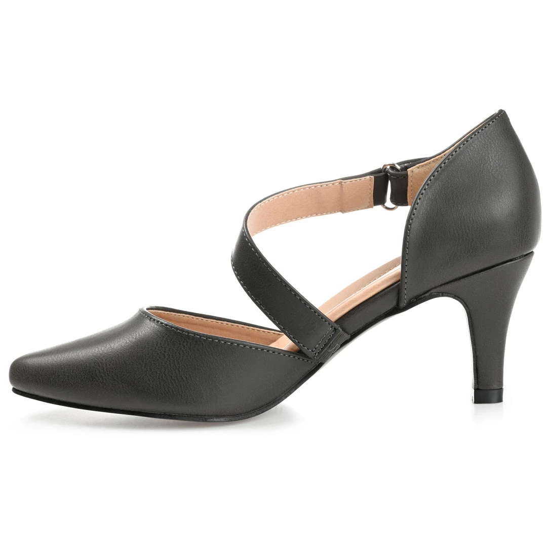A crossover strap adds a modern touch to this classic silhouette. The Tillis by Journee Collection is a pointed-toe d’Orsay rendered with soft vegan leather and a 4 mm Tru Comfort Foamβ’ insole. The look is finished with a low heel, an adjustable belt-loop closure, and a wide-width footbed to make them easy on the feet. Heel Height – 2 1/2-inch Heel Type – Heel Platform Height – 1/2-inch Shoe Width – Wide Closure Type – Buckle Toe Style – Pointed Lining – Faux Leather Upper Material – Faux Leather Outersole Material – Man-made Footbed – 4 MM Tru Comfort Foamβ’