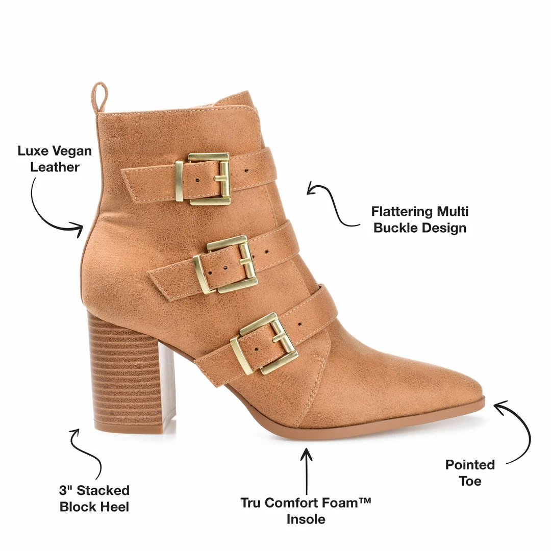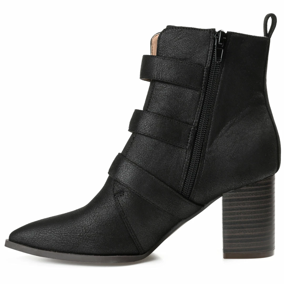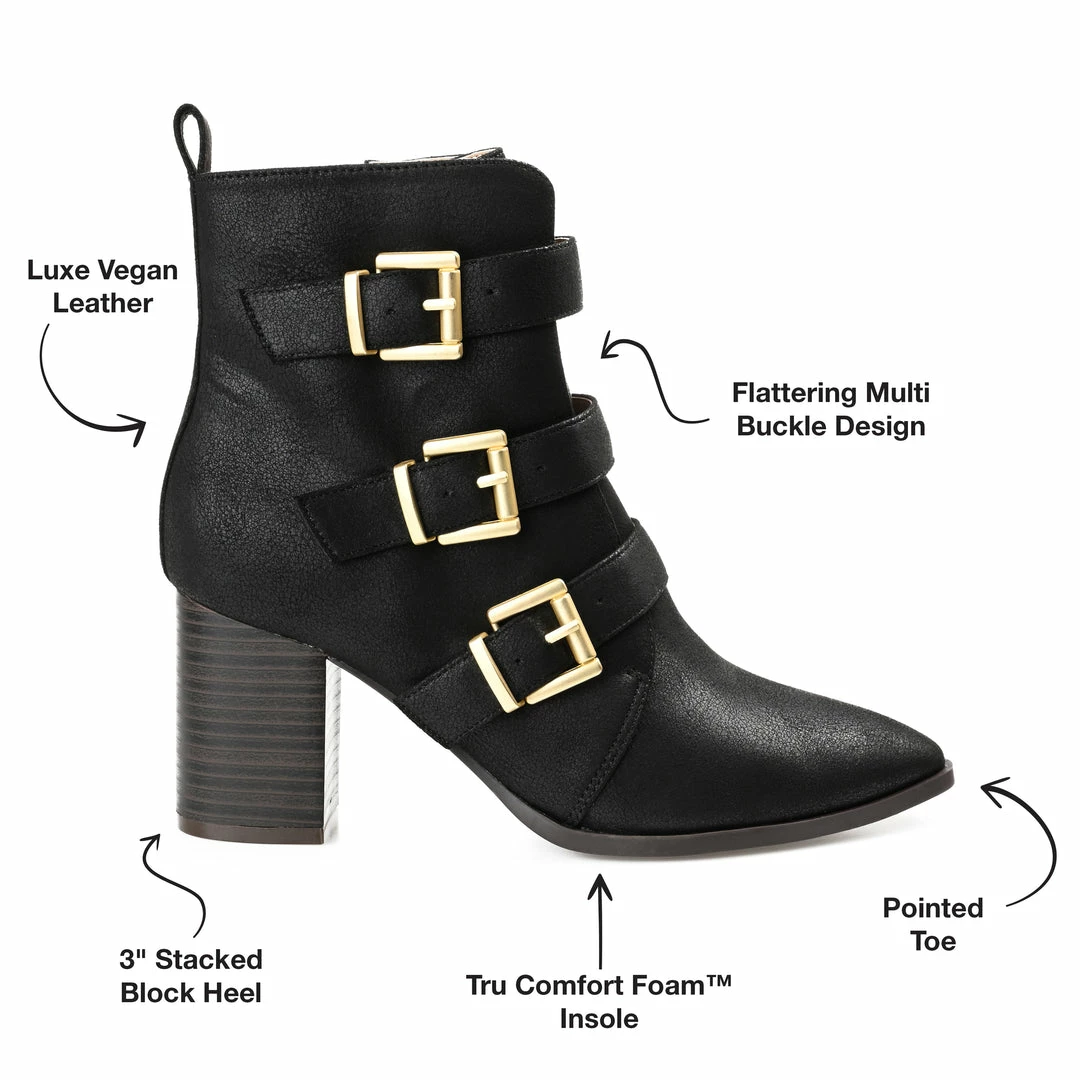 A classic bootie reimagined with triple buckle straps. The Winsley by Journee Collection is a pointed-toe silhouette featuring soft vegan leather detailed with an inside zipper and a tab at the ankle for easy entry. A chunky block heel adds the perfect amount of height, and a 4 mm Tru Comfort Foamβ’ insole offers unwavering support. Heel Height – 3-inch Heel Type – Stacked Platform Height – Flat-inch Shaft Height – 4 1/2 inches Top Circumference – 10 1/2 inches Shoe Width – Medium Closure Type – Inside Zip Toe Style – Pointed Lining – Fabric Upper Material – Vegan Leather Outersole Material – Man-made Footbed – 4 MM Tru Comfort Foamβ’