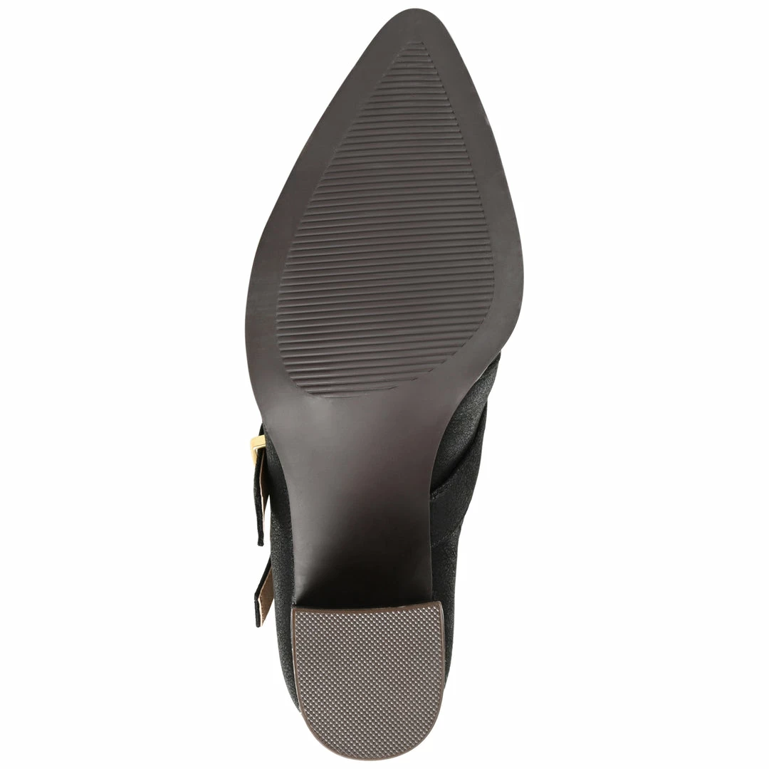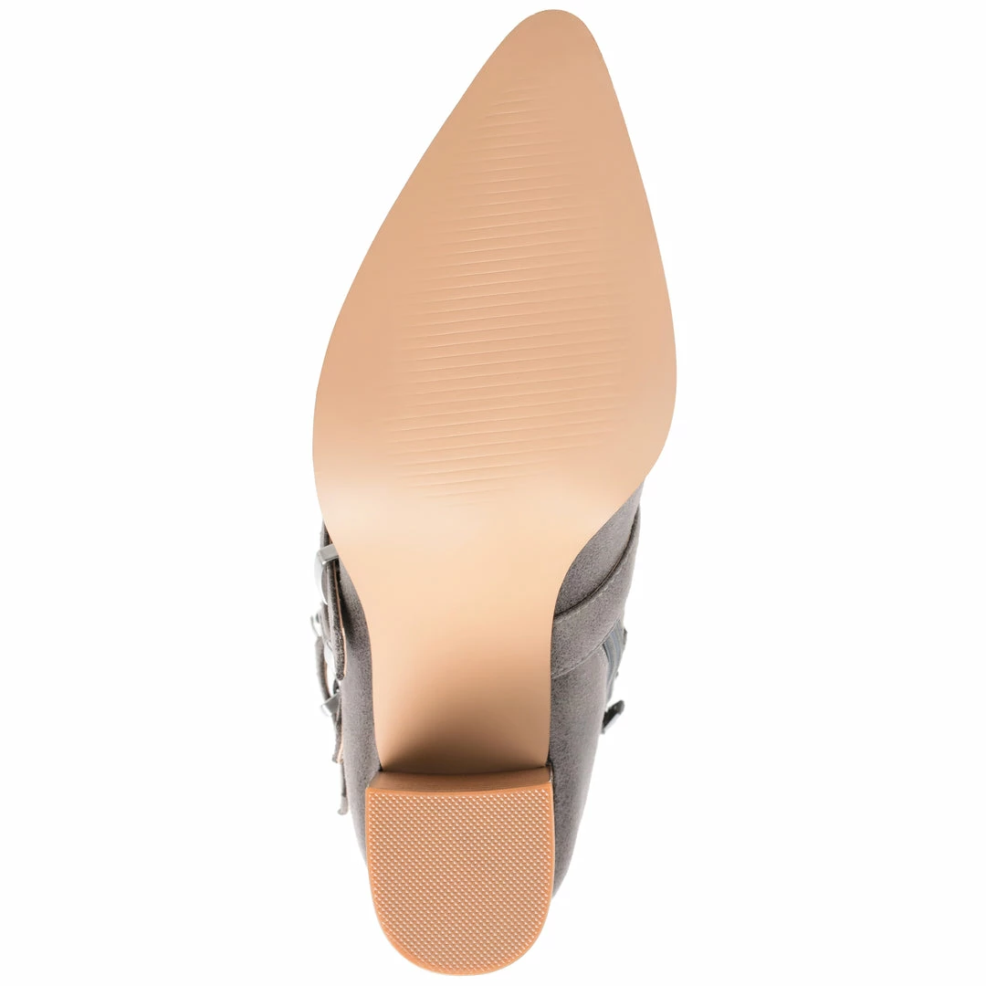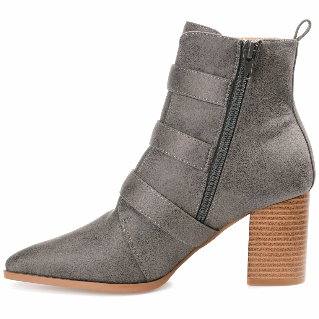 A classic bootie reimagined with triple buckle straps. The Winsley by Journee Collection is a pointed-toe silhouette featuring soft vegan leather detailed with an inside zipper and a tab at the ankle for easy entry. A chunky block heel adds the perfect amount of height, and a 4 mm Tru Comfort Foamβ’ insole offers unwavering support. Heel Height – 3-inch Heel Type – Stacked Platform Height – Flat-inch Shaft Height – 4 1/2 inches Top Circumference – 10 1/2 inches Shoe Width – Medium Closure Type – Inside Zip Toe Style – Pointed Lining – Fabric Upper Material – Vegan Leather Outersole Material – Man-made Footbed – 4 MM Tru Comfort Foamβ’