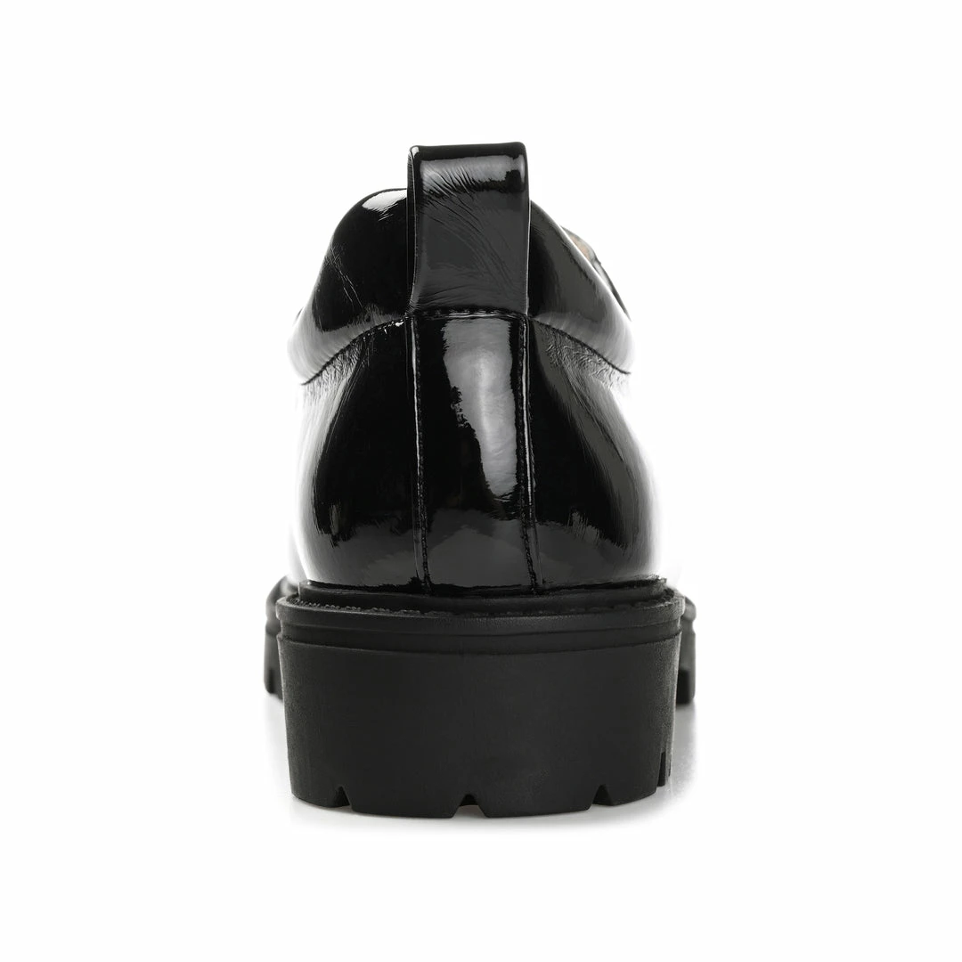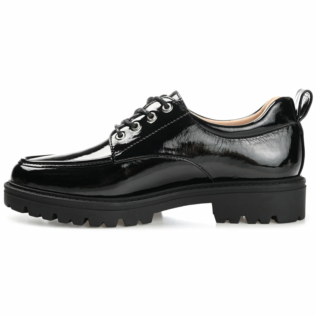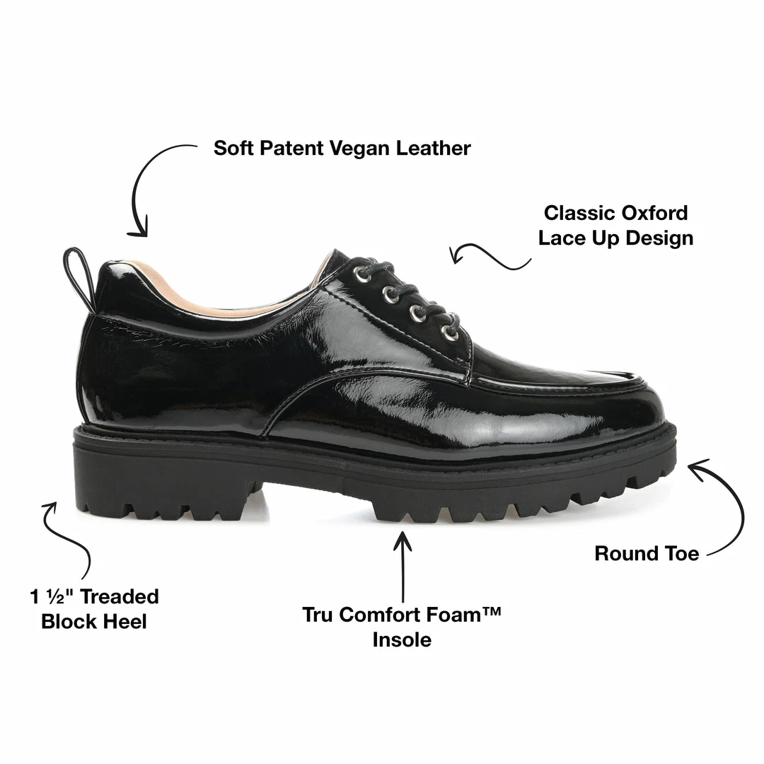 The sophistication of a dress shoe with the casual coolness of a sneaker, the Zina derby by Journee Collection. This lace-up oxford adds a charming note to any ensemble with its almond toe and moc detail. A chunky lug sole, patent vegan leather uppers, and a 4 mm Tru Comfort Foamβ’ footbed complete the design for a comfortable but stylish look. Heel Height – 1 1/2-inch Heel Type – Block Heel Platform Height – 1-inch Shoe Width – Medium Closure Type – Lace-up Toe Style – Almond Lining – Man-made Upper Material – Vegan Leather Outersole Material – Man-made Footbed – 4 MM Tru Comfort Foamβ’