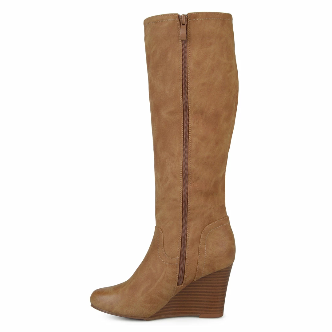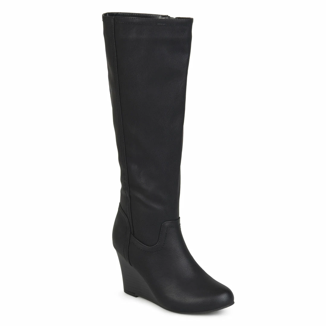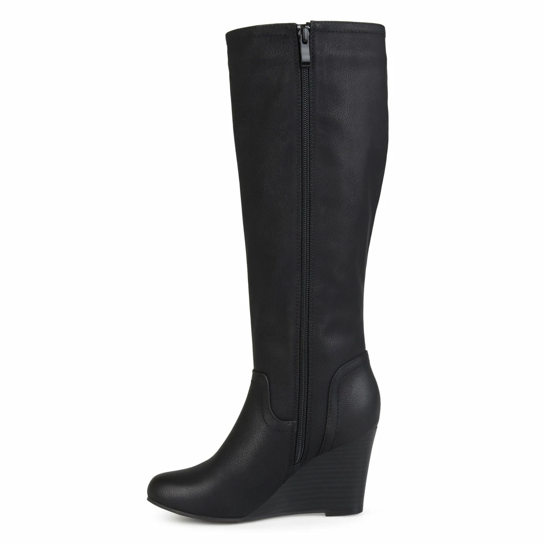 Show off classic design in wedge boots by Journee Collection. These fashionable boots are made with soft faux leather uppers that rise mid-calf and feature an inside zipper foot entry. Stacked wedge heels complete the style. Heel Height – 3-inch Heel Type – Wedge Platform Height – 1-inch Shaft Height – 15 1/2 inches Calf Circumference – 15 3/4 inches Top Circumference – 16 3/4 inches Shoe Width – Medium Closure Type – Inside Zip Toe Style – Round Lining – Faux Fur Upper Material – Faux Leather Outersole Material – Faux Leather over Synthetic Footbed – Padded