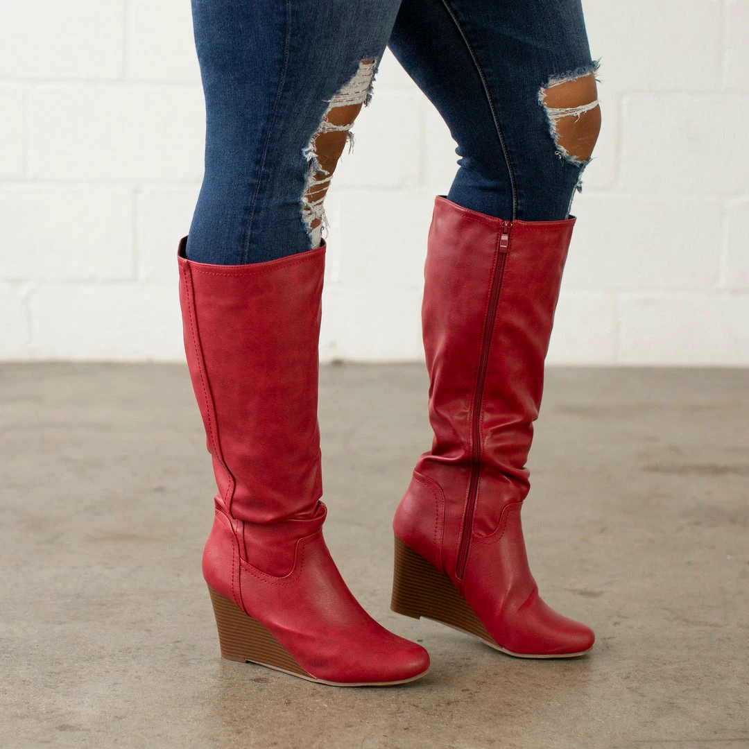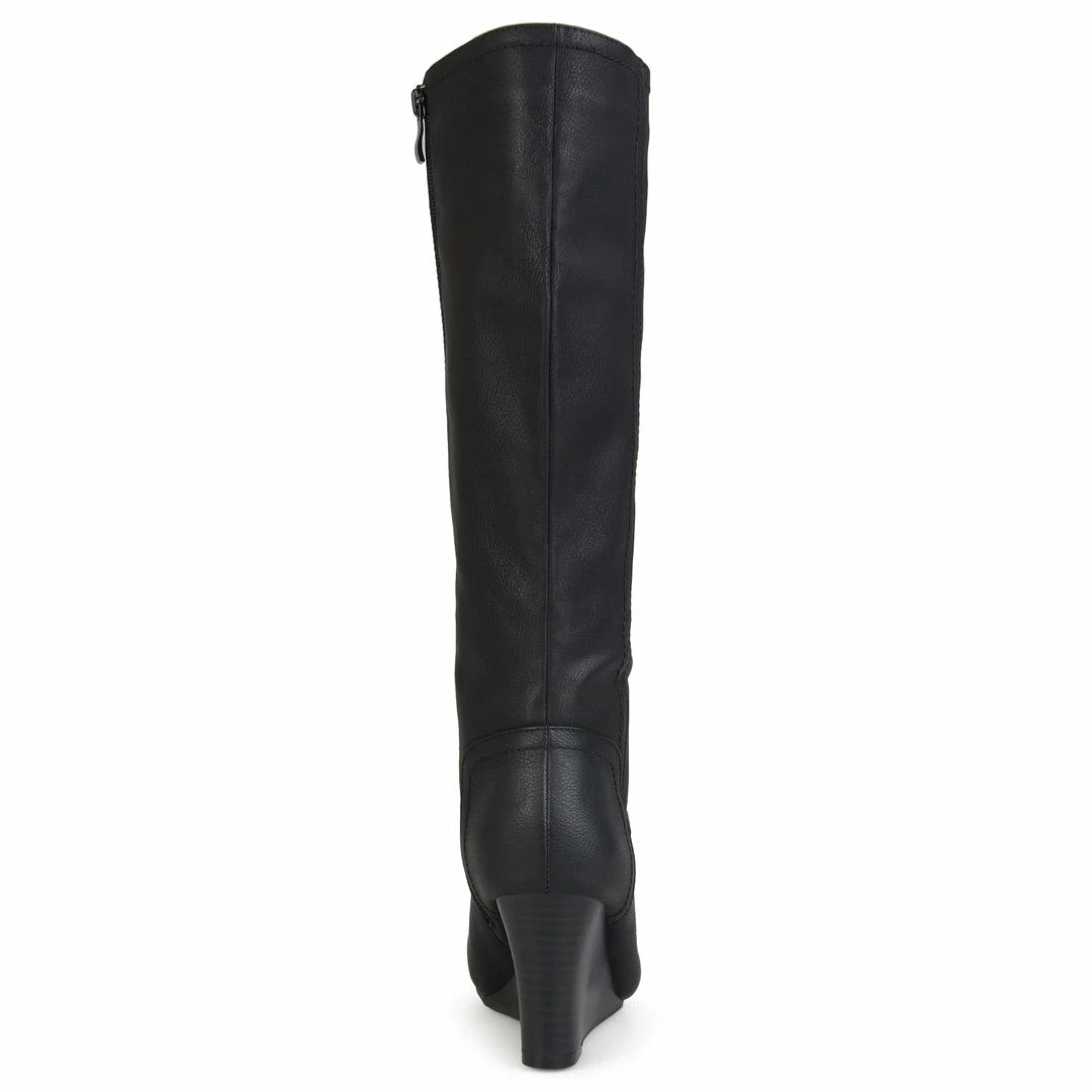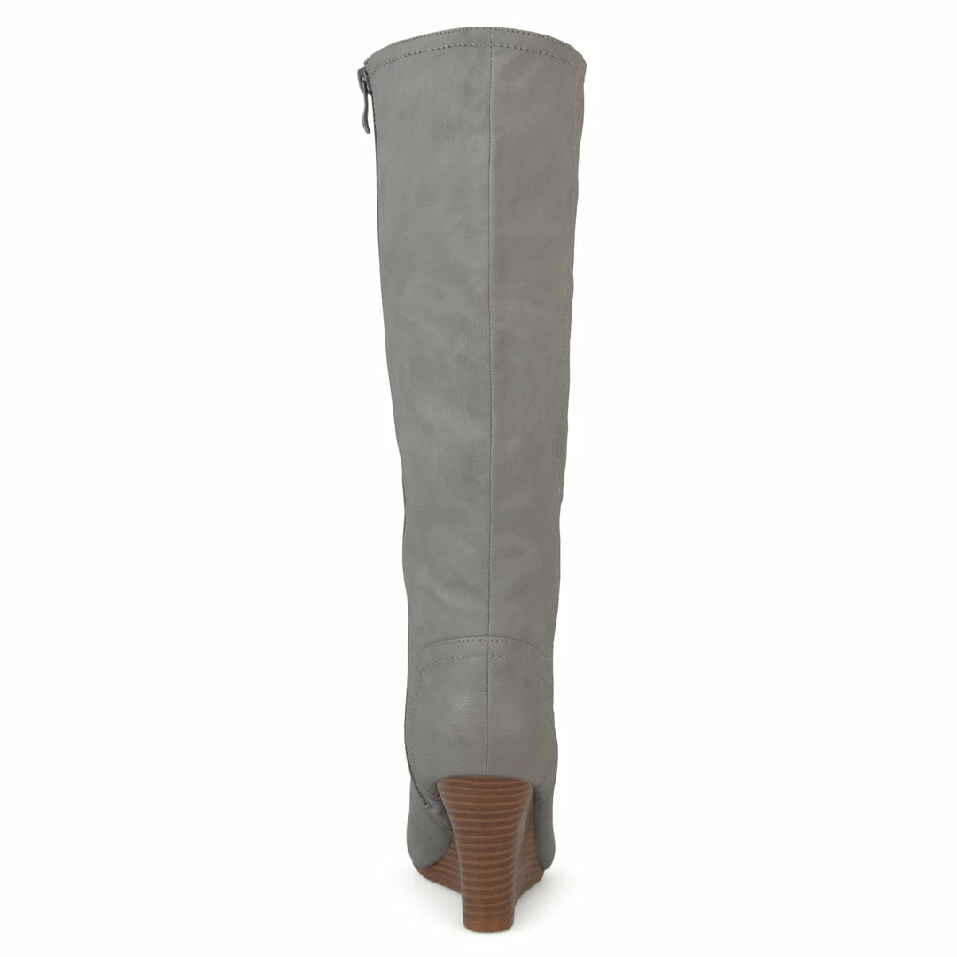 Show off classic design in wedge boots by Journee Collection. These fashionable boots are made with soft faux leather uppers that rise mid-calf and feature an inside zipper foot entry. Stacked wedge heels complete the style. Heel Height – 3-inch Heel Type – Wedge Platform Height – 1-inch Shaft Height – 15 1/2 inches Calf Circumference – 15 3/4 inches Top Circumference – 16 3/4 inches Shoe Width – Medium Closure Type – Inside Zip Toe Style – Round Lining – Faux Fur Upper Material – Faux Leather Outersole Material – Faux Leather over Synthetic Footbed – Padded