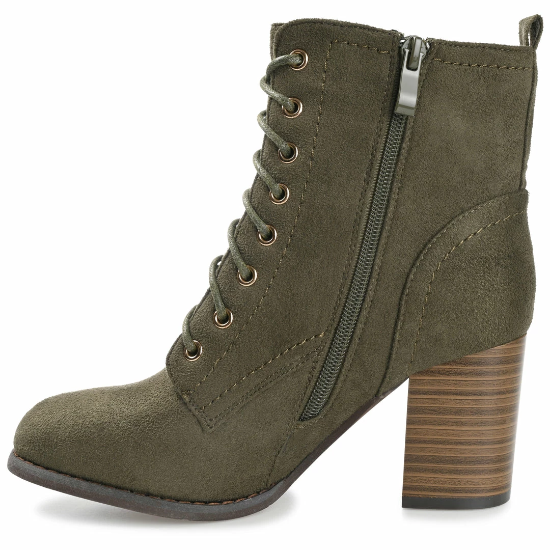 Our take on the military bootie, the Baylor by Journee Collection. This cool style features soft vegan leather uppers that rise above the ankles, accented by a classic lace-up closure. A stacked block heel, wide-width footbed, and padded insole perfect the design. Heel Height – 2 3/4-inch Heel Type – Stacked Platform Height – 1/2-inch Shaft Height – 6 inches Top Circumference – 11 1/2 inches Shoe Width – Wide Closure Type – Lace-up Toe Style – Round Lining – Fabric Upper Material – Faux Suede Outersole Material – Man-made Footbed – Padded