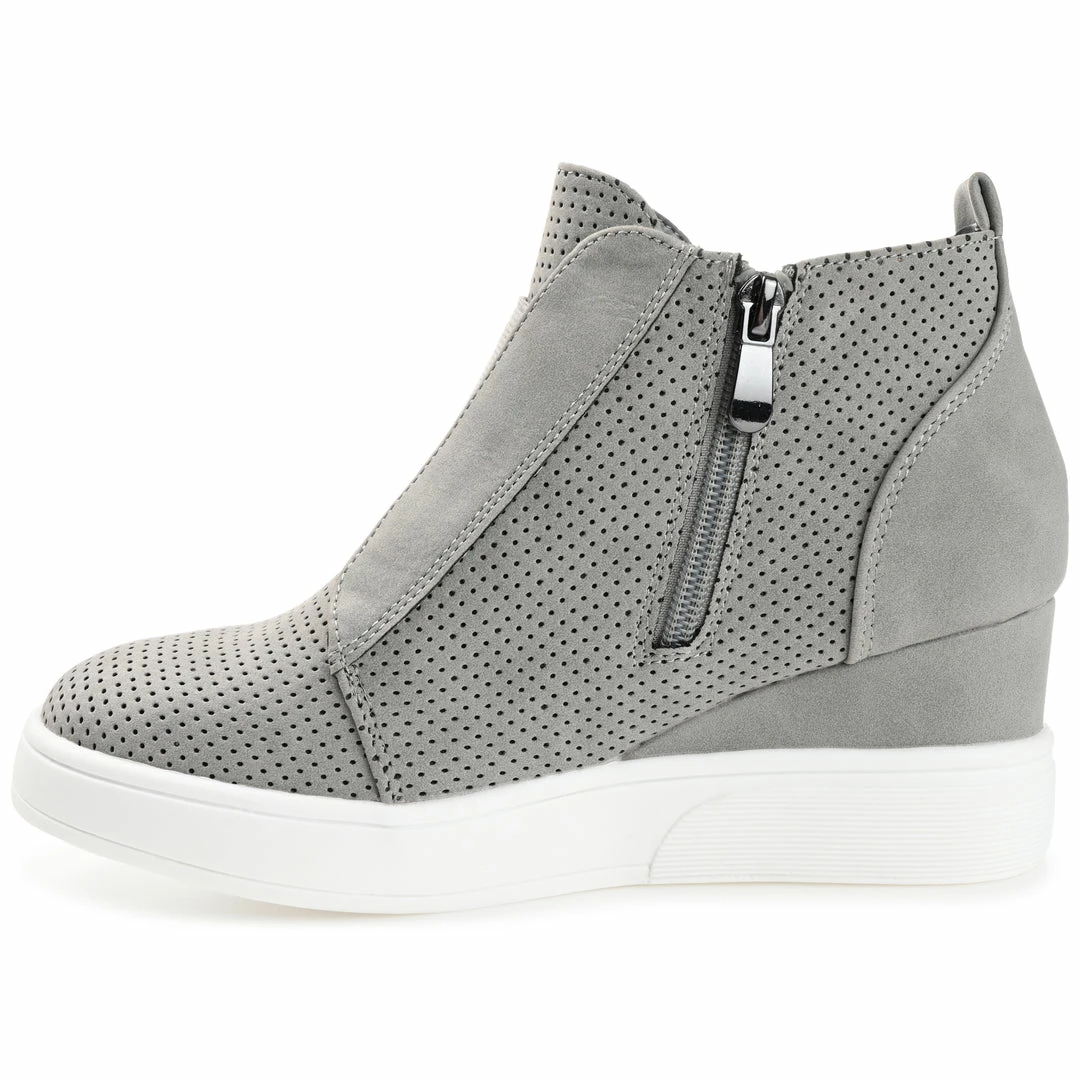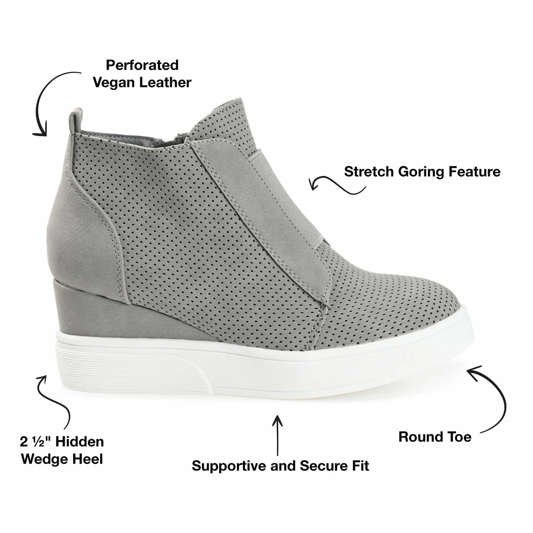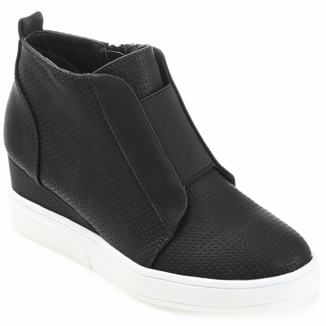 In the Clara sneakers by Journee Collection, you’ll always look effortlessly chic. The uppers of this everyday style are made with soft vegan leather with pinhole details for a textured look. Wedge heels and a padded insole complete this wide-width style for a comfortable lift. Heel Height – 2 1/2-inch Heel Type – Wedge Platform Height – 1-inch Shoe Width – Wide Closure Type – Inside Zip Toe Style – Round Lining – Faux Leather Upper Material – Faux Leather Outersole Material – Man-made Footbed – Padded