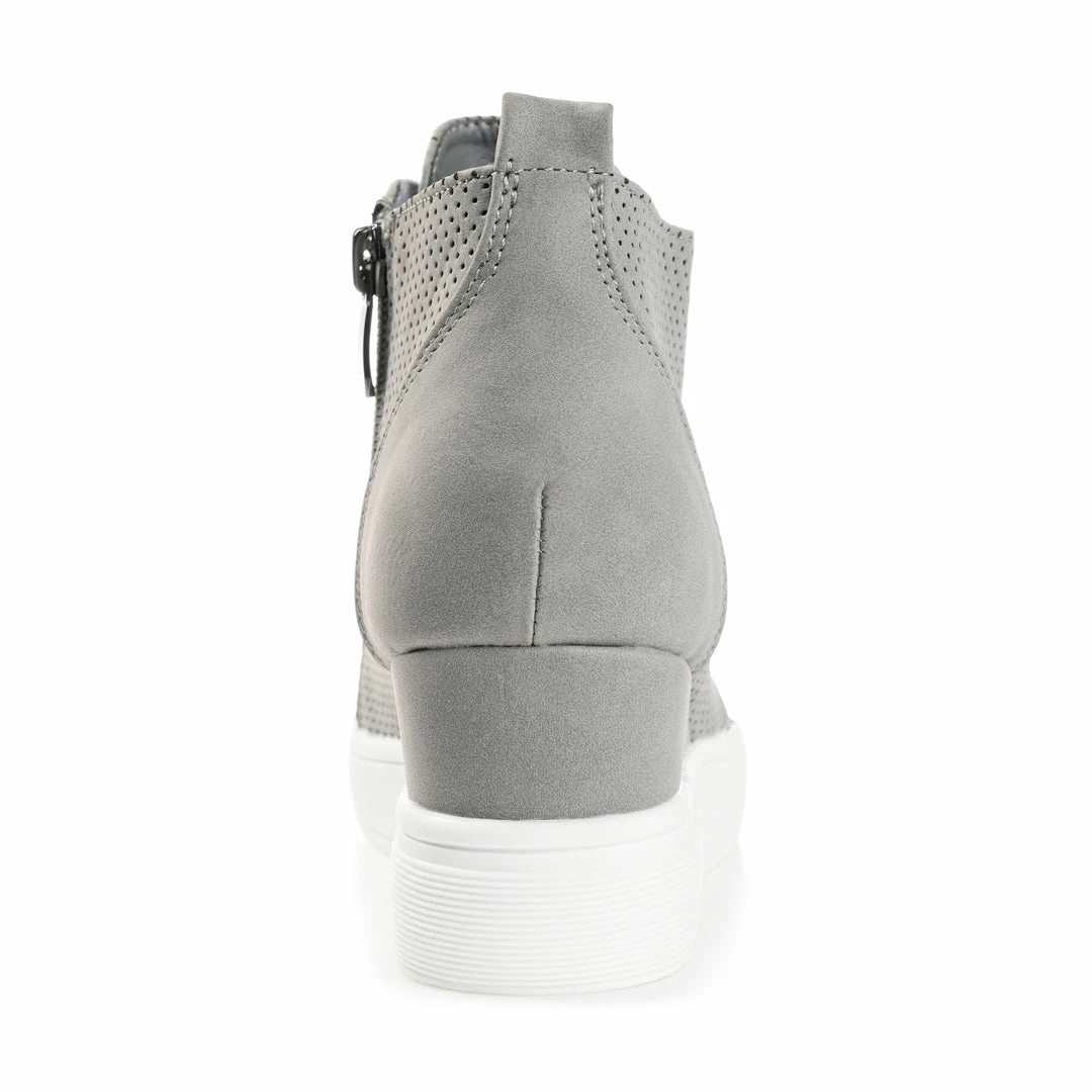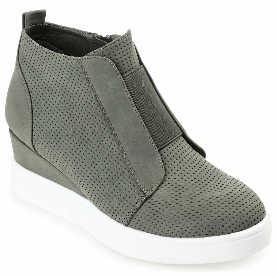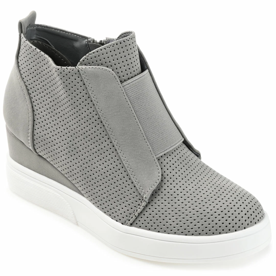 In the Clara sneakers by Journee Collection, you’ll always look effortlessly chic. The uppers of this everyday style are made with soft vegan leather with pinhole details for a textured look. Wedge heels and a padded insole complete this wide-width style for a comfortable lift. Heel Height – 2 1/2-inch Heel Type – Wedge Platform Height – 1-inch Shoe Width – Wide Closure Type – Inside Zip Toe Style – Round Lining – Faux Leather Upper Material – Faux Leather Outersole Material – Man-made Footbed – Padded
