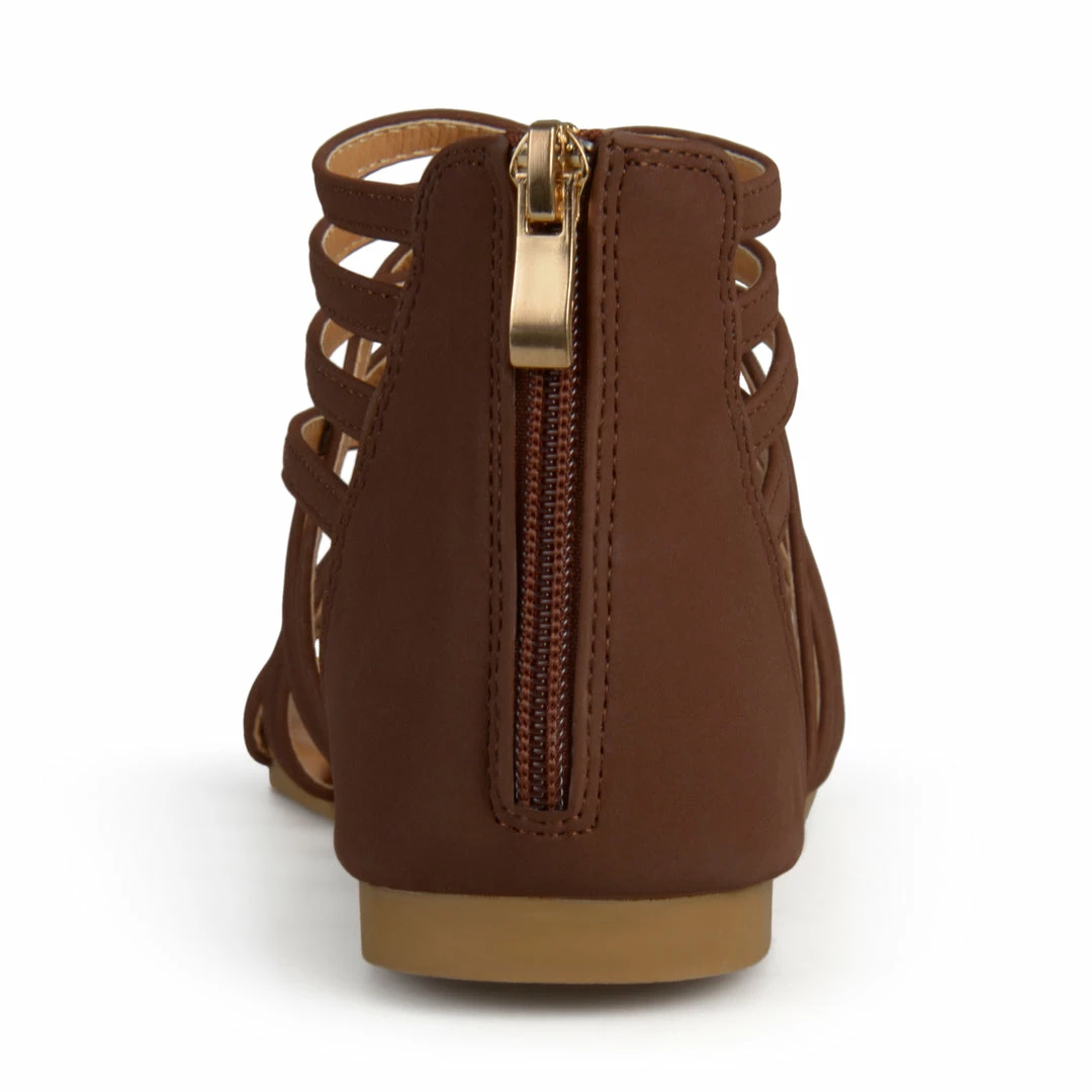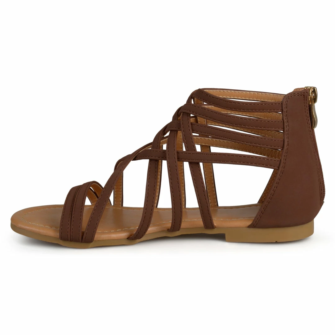Show off the best boho look this season with strappy flat sandals by Journee Collection. Intricate straps overlap and create a basket weave design for a decorative appearance. A wide-width footbed creates a spacious design for comfortable all-day wear Heel Height – 1/2-inch Heel Type – Block Heel Platform Height – 1/2-inch Shoe Width – Wide Closure Type – Back Heel Zip Toe Style – Round Lining – Faux Leather Upper Material – Faux Leather Outersole Material – Man-made Footbed – Padded