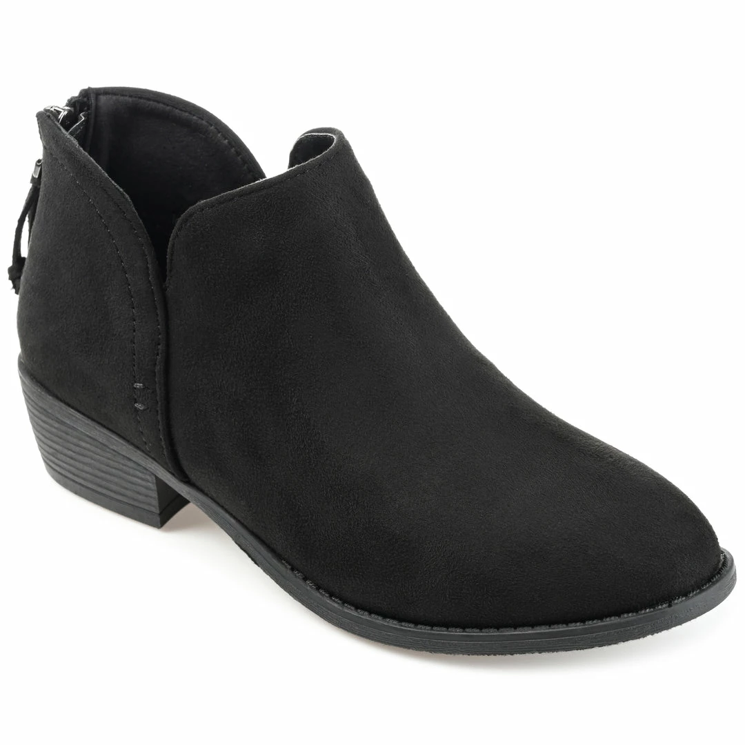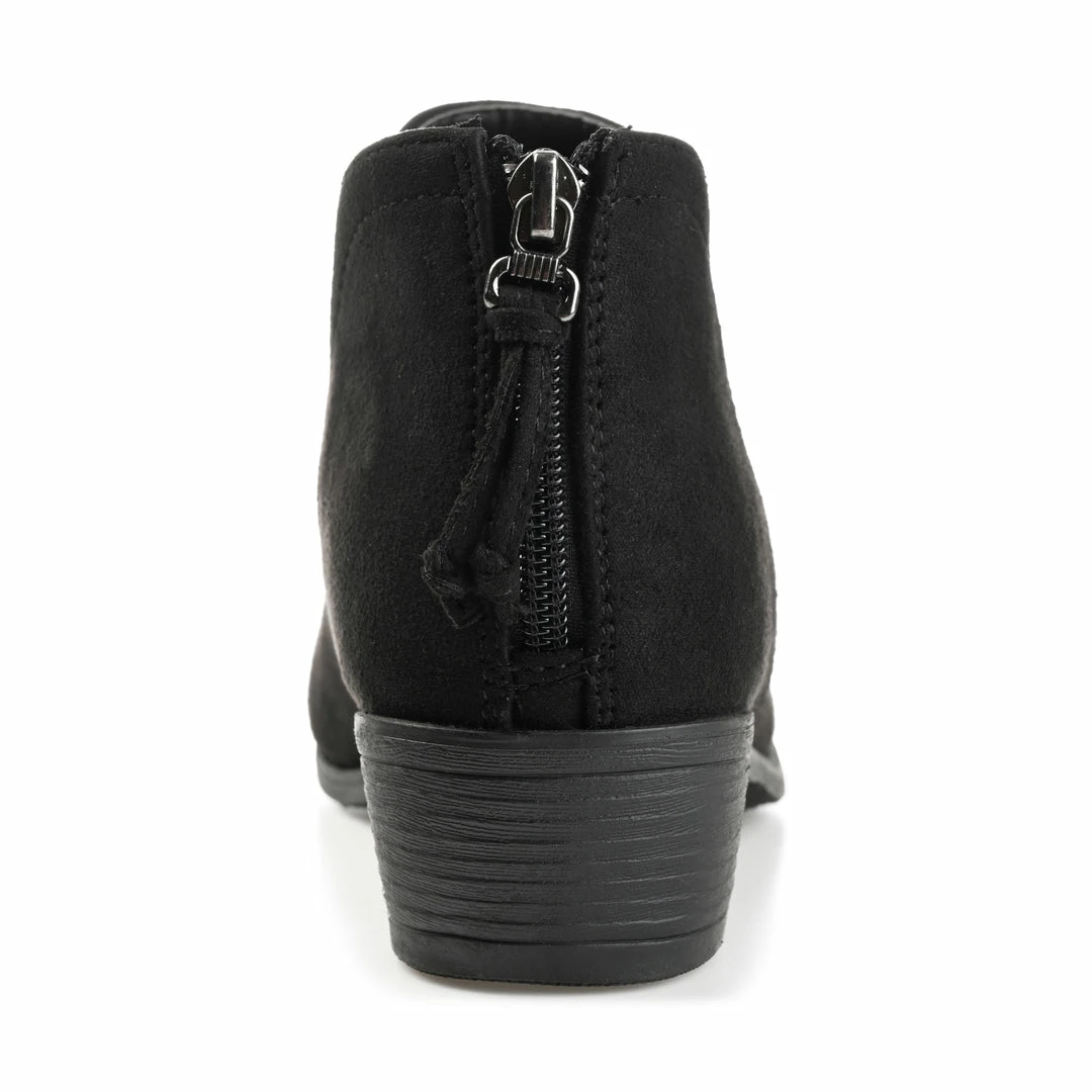 Notches on each side create an ankle framing fit on the Livvy bootie by Journee Collection. This wide-width wardrobe staple is made with vegan leather that rises to the ankles and a padded insole for a comfortable fit. A tasseled zipper entry at the back adds a modern touch and a block heel adds the perfect lift. Heel Height – 1 1/2-inch Heel Type – Stacked Platform Height – 1/2-inch Shaft Height – 3 1/2 inches Top Circumference – 11 1/2 inches Shoe Width – Wide Closure Type – Back Heel Zip Toe Style – Round Lining – Fabric Upper Material – Faux Suede Outersole Material – Man-made Footbed – Padded
