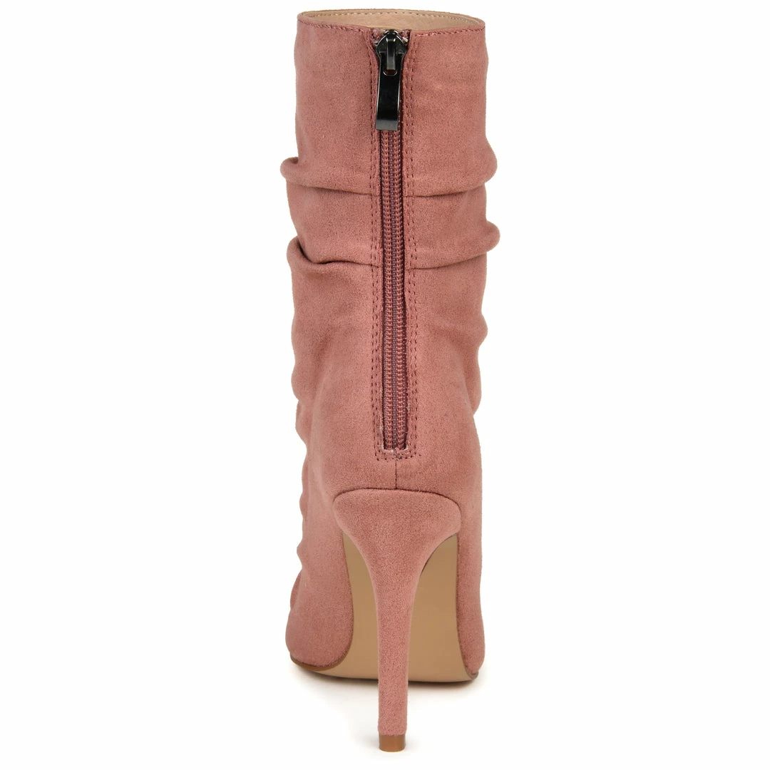A slouchy bootie with a pointed toe and a shapely silhouette. The Markie by Journee Collection has vegan leather uppers with a rear zipper entrance for a flirty look. This wide-width style is grounded by a slim stiletto heel and a cushioned footbed. Heel Height – 4-inch Heel Type – Stiletto Platform Height – Flat-inch Shaft Height – 6 1/2 inches Top Circumference – 11 inches Shoe Width – Wide Closure Type – Back Heel Zip Toe Style – Pointed Lining – Fabric Upper Material – Vegan Leather Outersole Material – Man-made Footbed – Cushioned