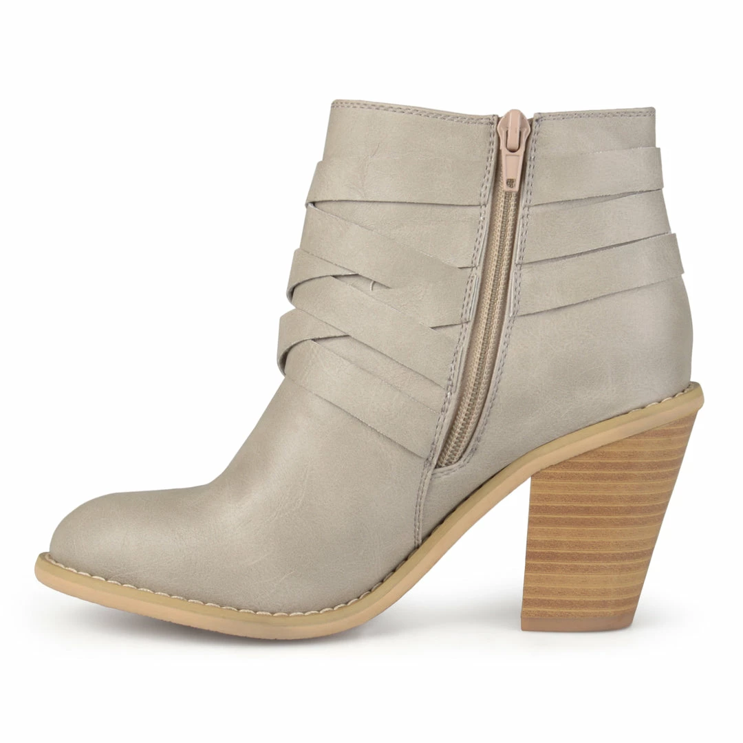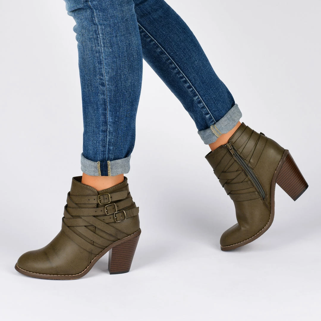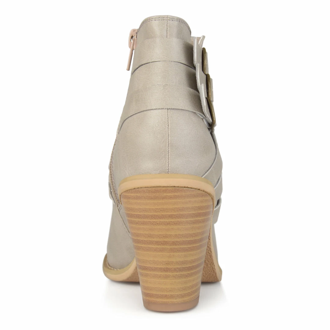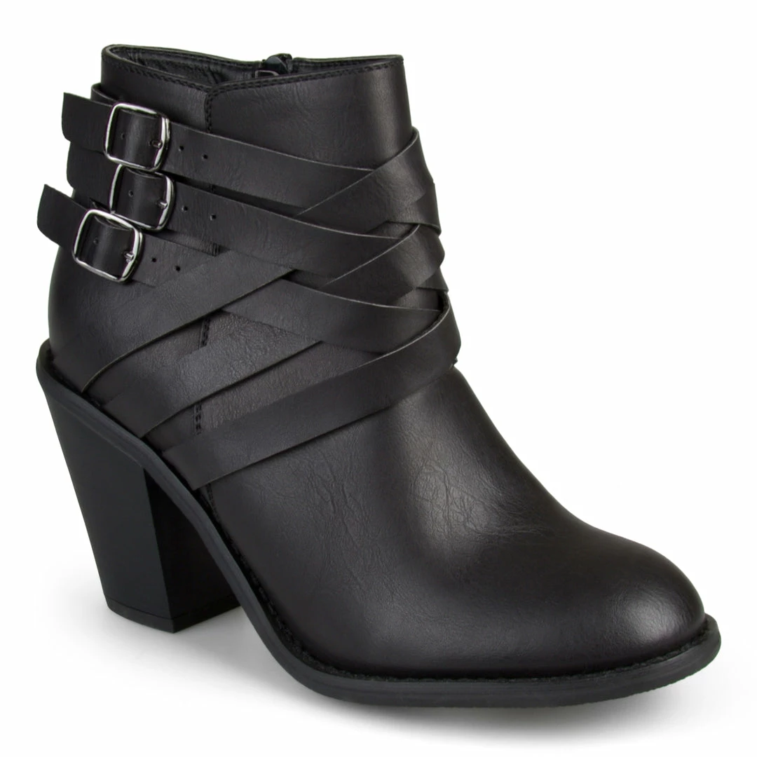 Show off stylish straps with wide-width ankle booties by Journee Collection. Faux leather uppers rise to the ankles with a chic strappy design accented with buckle detail. Faux woodgrain outsoles compliment the style and chunky heels finish the look Heel Height – 3 1/4-inch Heel Type – Stacked Platform Height – 1/2-inch Shaft Height – 5 inches Top Circumference – 11 inches Shoe Width – Wide Closure Type – Inside Zip Strap Type – Ankle Toe Style – Round Lining – Fabric Upper Material – Faux Leather Outersole Material – Man-made Footbed – Padded