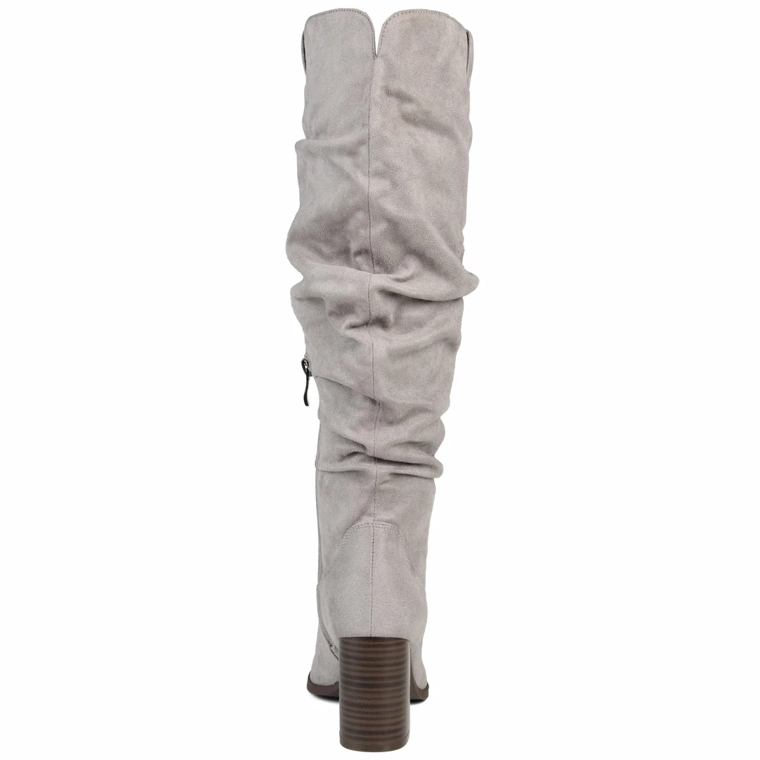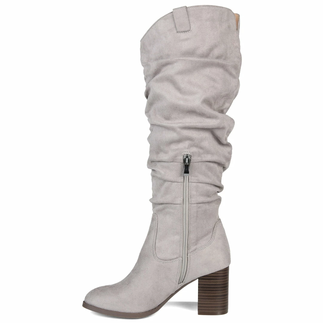 A style specially made for slouchy boot fans, the Aneil by Journee Collection. This modern boot is fashionable and well-fitted thanks to its vegan leather uppers, wide-calf, and wide-width footbed. A classic almond toe and stacked block heel add a western twist. Heel Height – 3-inch Heel Type – Stacked Platform Height – 1/2-inch Shaft Height – 15 inches Calf Circumference – 16 1/2 inches Top Circumference – 16 3/4 inches Shoe Width – Wide Closure Type – Inside Zip Toe Style – Almond Lining – Fabric Upper Material – Faux Suede Outersole Material – Man-made Footbed – Padded